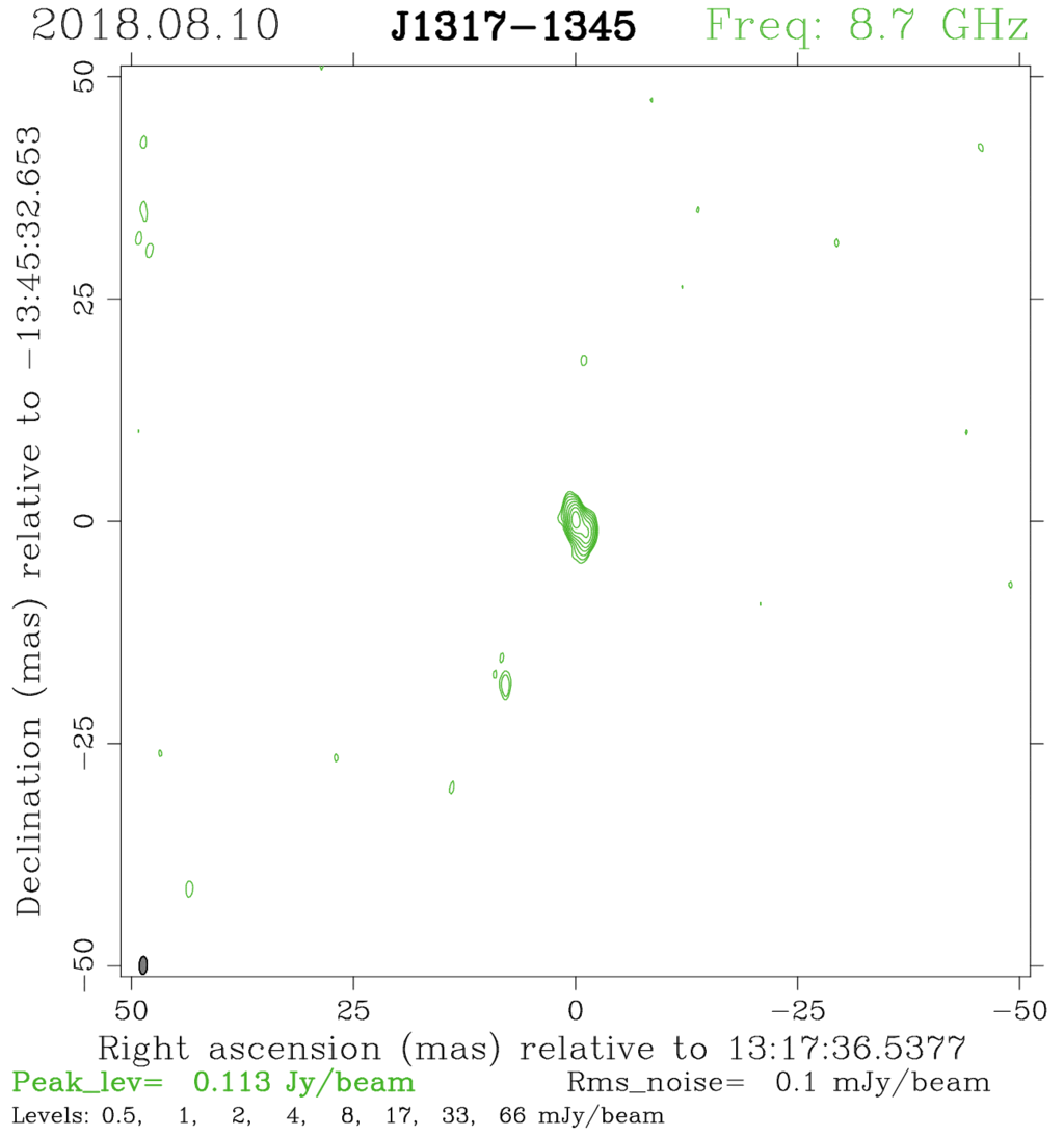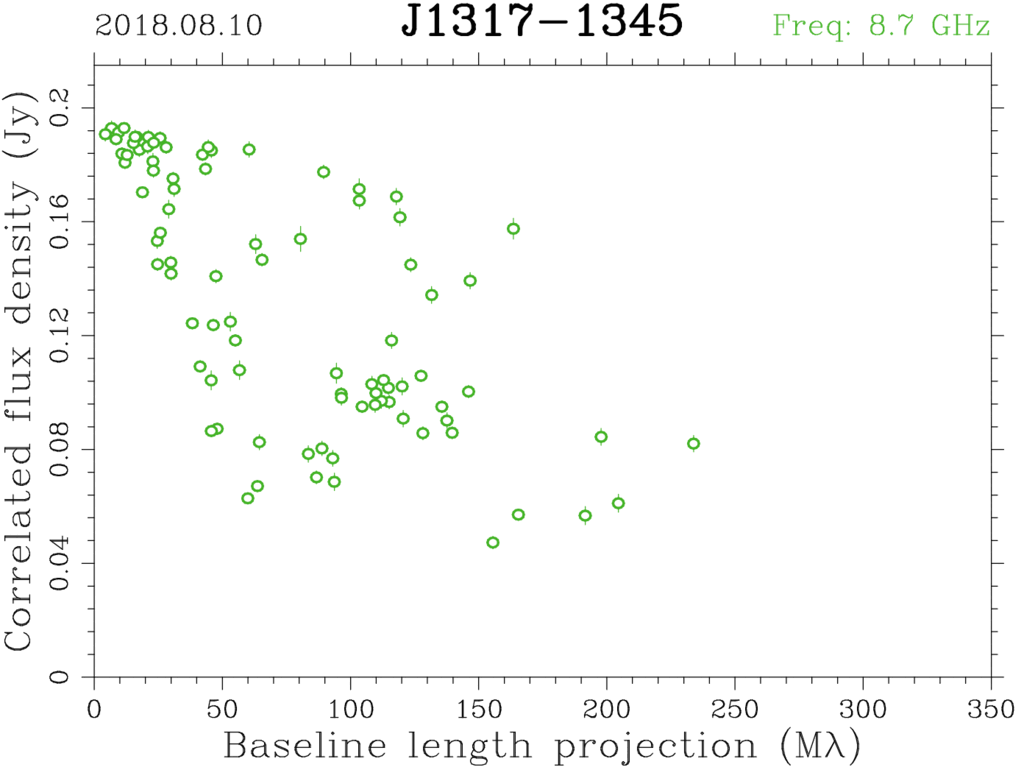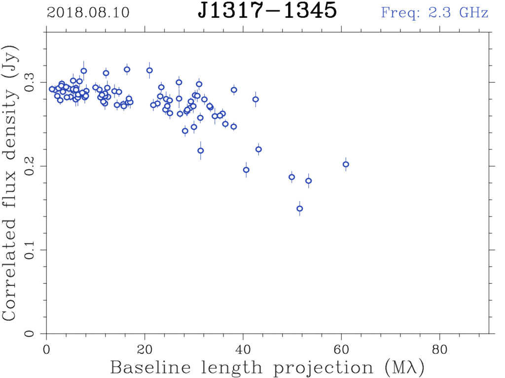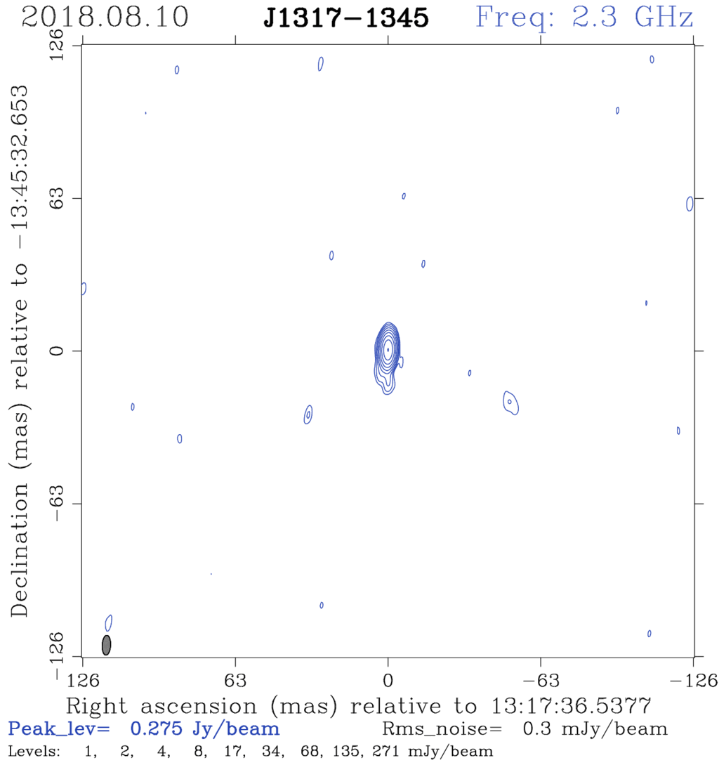 Visibility plots and contour images are from L. Petrov's Radio Fundamental Catalog, used with permission. If no contour level information is given, the lowest contour is 3mJy and the contours are -1,1,2,4,8,16,32, etc. times the lowest contour level. Users are encouraged to consult the NASA's RFC catalogs and NASA VLBI Calibrator Search for both past and more recent observations.