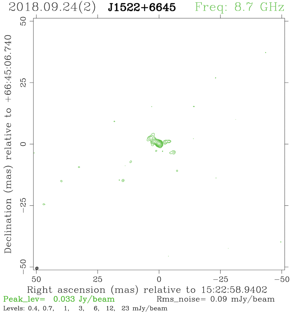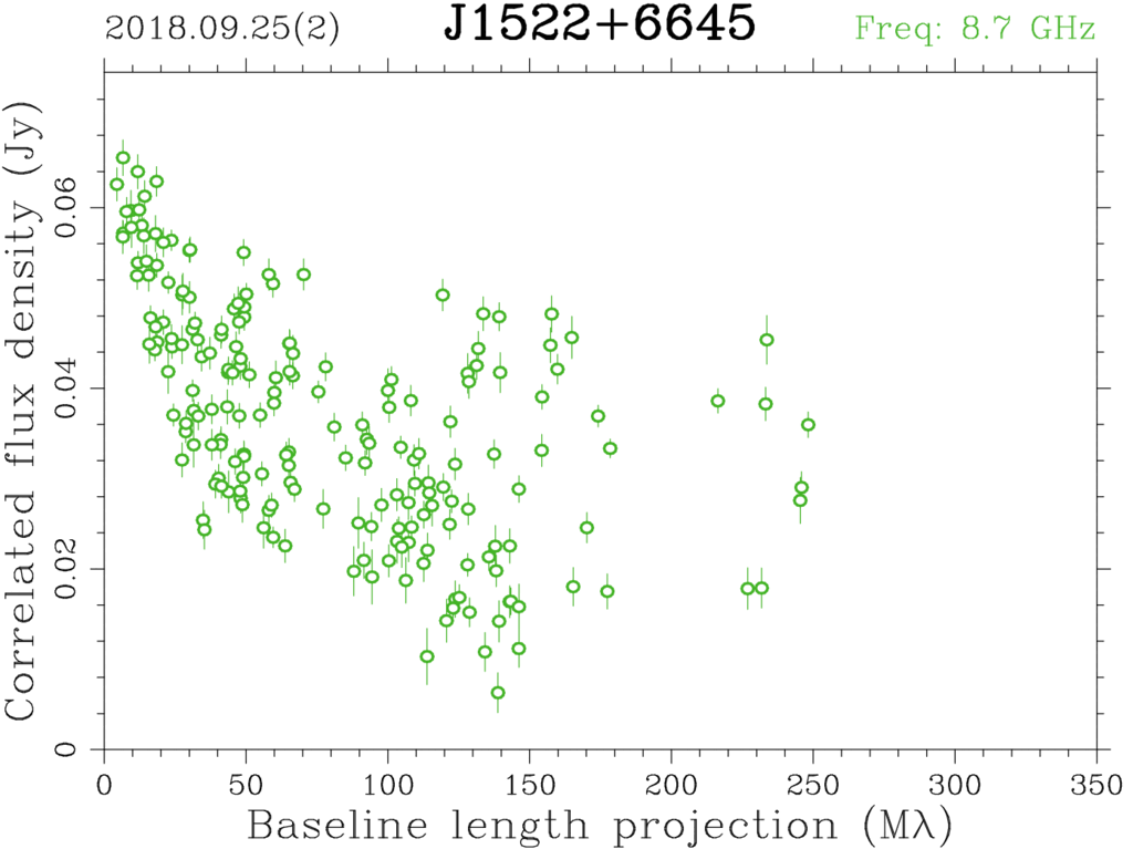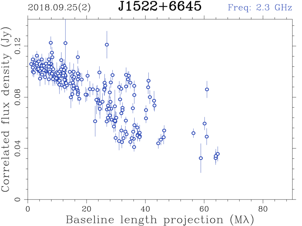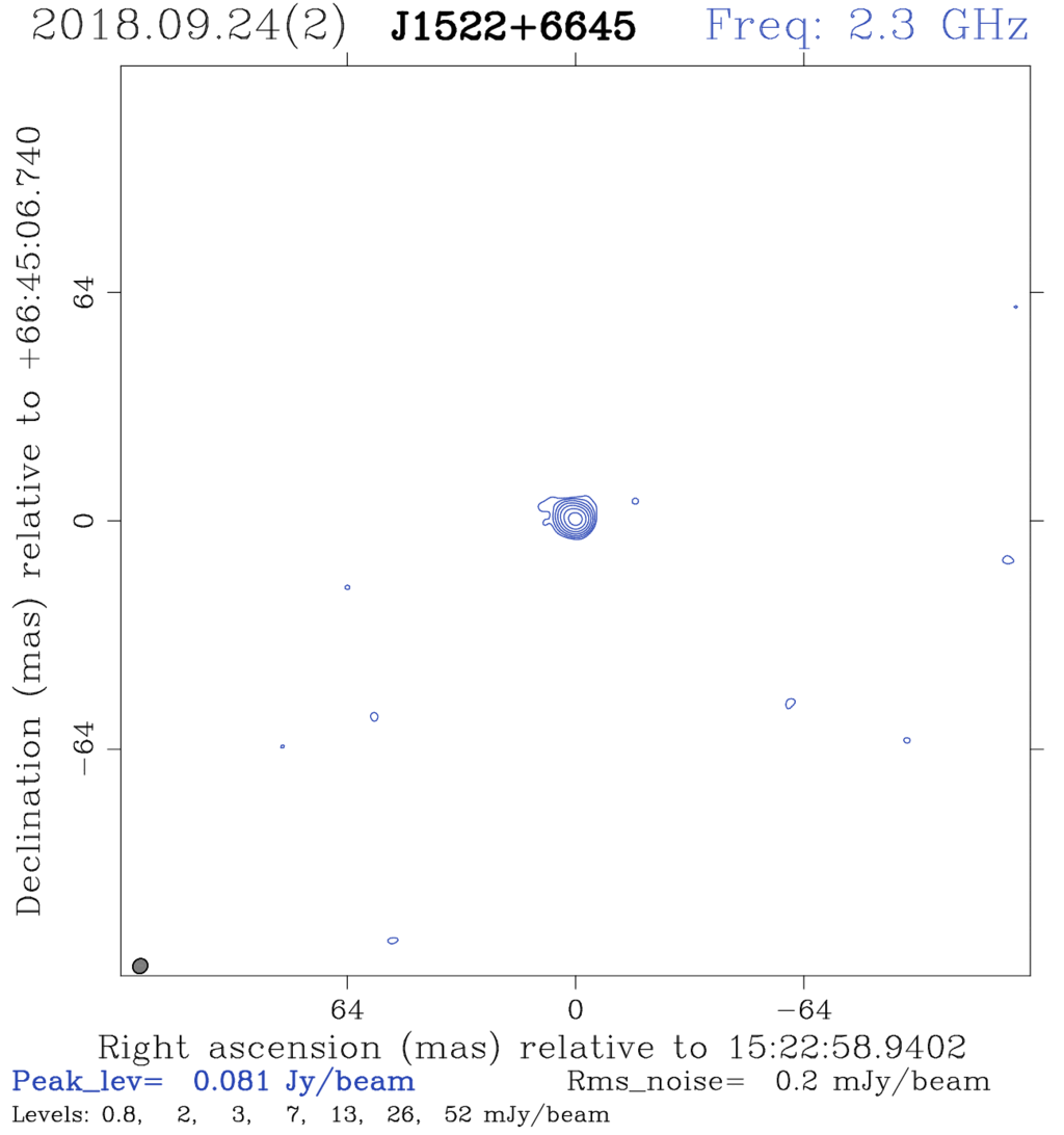 Visibility plots and contour images are from L. Petrov's Radio Fundamental Catalog, used with permission. If no contour level information is given, the lowest contour is 3mJy and the contours are -1,1,2,4,8,16,32, etc. times the lowest contour level. Users are encouraged to consult the NASA's RFC catalogs and NASA VLBI Calibrator Search for both past and more recent observations.